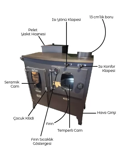 Bu üstün özelliklere sahip hibrit soba, hem pelet hem de odun yakabilme özelliği ile evinizi ısıtmak ve pişirme ihtiyaçlarınızı karşılamak için tasarlanmıştır. Modern tasarımı ve dayanıklı malzemeleri ile hem estetik hem de fonksiyonel bir çözüm sunar.